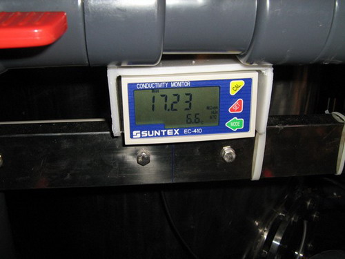 實際生產(chǎn)運行中,單級反滲透產(chǎn)水電導率為1.98μS/cm,混合床離子交換系統(tǒng)單級出水即達到17.23MΩ·CM,完全滿足廠方生產(chǎn)制造的用水需要。